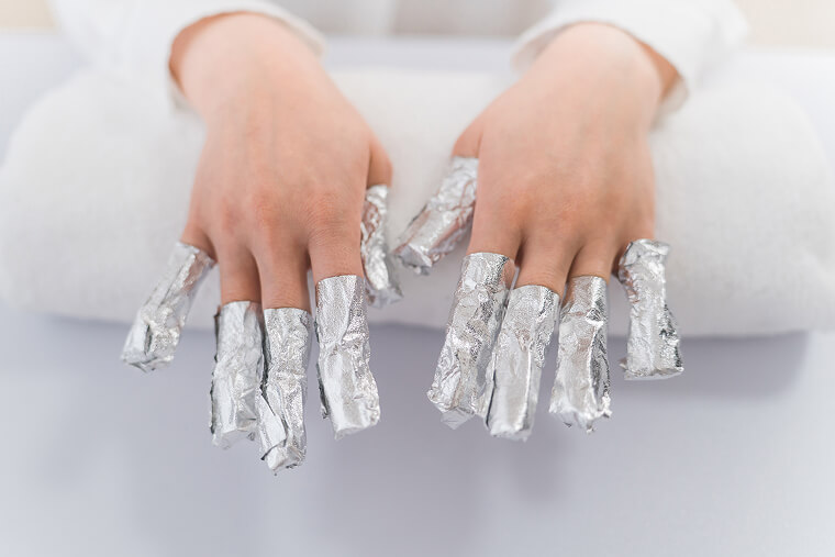 ジェルネイルを溶かす作用があるアセトンをコットンに染み込ませ、爪全体を覆います。アセトンが揮発しないよう、コットンの上からアルミホイルで巻いてください。